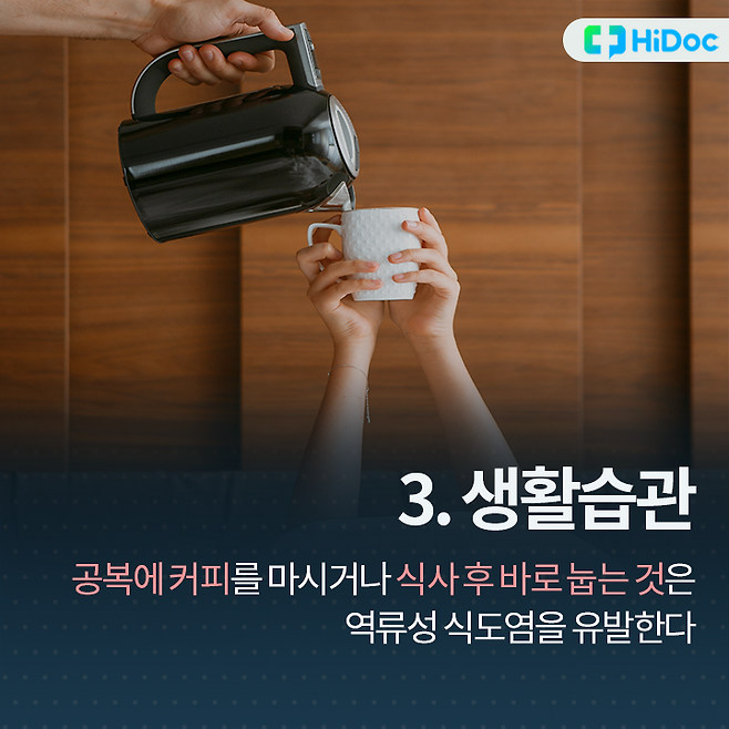 3. 생활습관공복에 커피를 마시거나 식사 후에 바로 눕는 습관은 역류성 식도염을 유발하고, 악화시키는 요인이다.