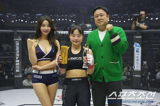 갤러리K 이효진 상무가 13일 서울 장충체육관에서 열린 굽네 ROAD FC 068 -55㎏ 계약체중 매치에서 승리한 신유진에게 아테나상을 시상하고 기념촬영을 하고 있다. 사진제공=로드FC