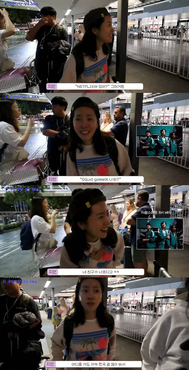 이어 "예전엔 직업란에 '프리랜서'라고 썼는데 요즘엔 '배우'라고 쓴다. 공항 직원들이 궁금해하면서 '너 어디나와?' '넷플리스 나와?'라고 묻더라"라며 "'너 오징어 게임'에 나와? 물어보더라"라고 울상을 지었다.