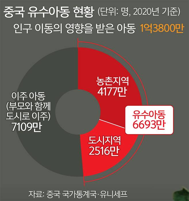 유수아동은 1980년대부터 급증한 농민공(일자리를 찾기 위해 도시로 떠난 농민) 자녀들이 농촌에 남겨지면서 생겨났다. 이들은 다른 호적지로 이동을 제한하는 중국 후커우(호적) 제도 때문에 도시에서 의무교육을 받을 수 없어 고향에 남겨진다. 지난해 5월 중국 국가통계국과 유니세프가 발표한 보고서에 따르면 2020년까지 중국에는 6693만명의 유수아동이 있었고, 이 중 4177만명이 농촌 지역에 거주했다. 지난해 중국 교육부는 의무교육 단계에 있는 유수아동만도 1555만6000명에 달한다고 밝혔다.
