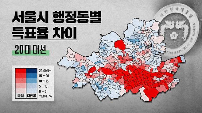 당시 윤 후보는 서울 25개 자치구 중 절반이 넘는 14곳에서 승리했는데, 특히 강서구를 제외한 한강 벨트 대부분을 차지했습니다. 행정동 성적표도 좋았습니다. 425개 행정동 가운데 국민의힘 245개, 민주당은 180개 동네에서 승리를 가져갔습니다.