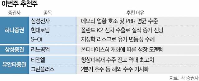 하나증권은 현대로템(064350)도 추천주로 올렸다. K2 전차의 세계 시장 판매가 확대되면서 향후 실적 증가를 예상했다. 실제 현대로템은 1분기 폴란드로 K2 전차 18대를 납품해 실적 증가가 예상되고 있다. 향후 루마니아로의 K2 전차 수주 규모도 예상 대비 클 것이라고 하나증권은 전망했다. 이 밖에 메모리 업황 호조가 지속되고 주가순자산비율(PBR)이 평균치에 머물고 있는 삼성전자(005930)도 계속 추천 종목에 올렸다.