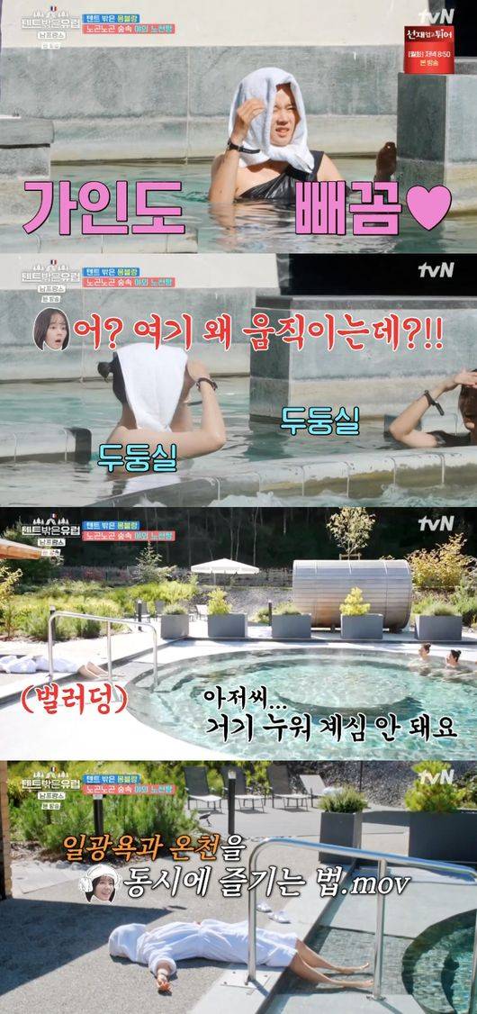 가운을 입고 대자로 누운 한가인의 모습에 라미란은 “가인아, 아저씨 거기 누워 계시면 안 돼요”라고 놀렸다. 하지만 기운이 없는 한가인은 손 흔들기로 화답하며 본인만의 방법으로 노천탕을 즐겼다.