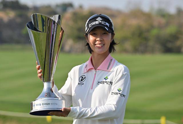 박지영이 14일 인천 클럽72 하늘코스(파72)에서 막을 내린 한국여자프로골프(KLPGA) 투어 제3회 메디힐·한국일보 챔피언십(총상금 10억 원)에서 우승한 뒤 트로피를 들고 활짝 웃고 있다.