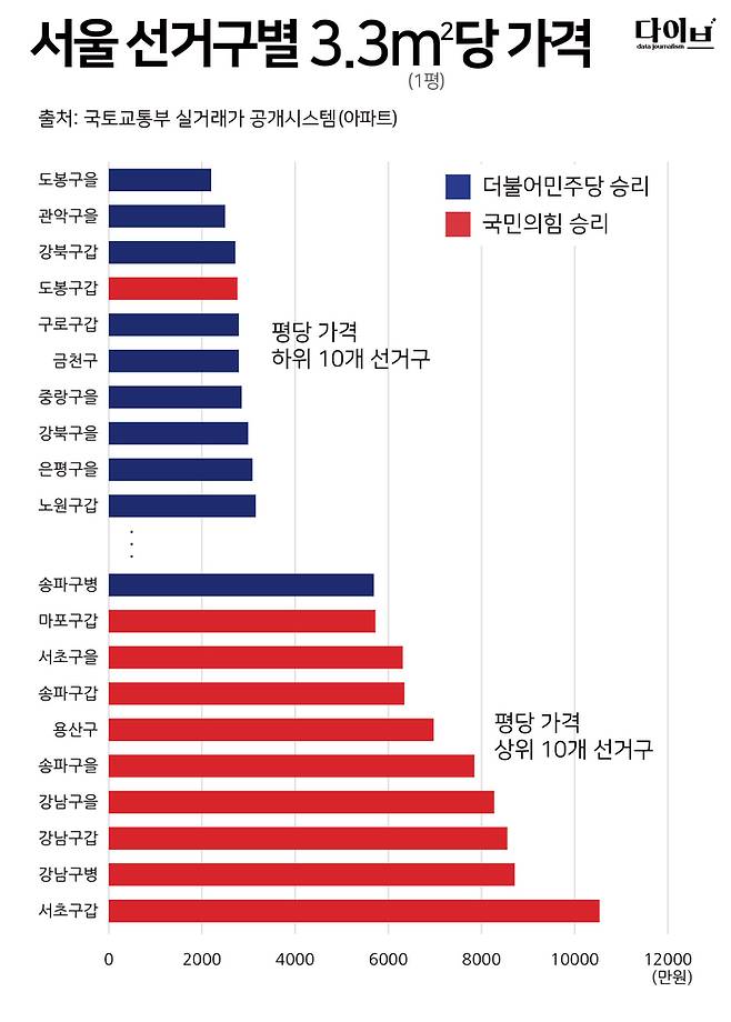 선거구별로 넓혀 보면 3.3㎡당 아파트 실거래가 하위 10개 선거구에서는 도봉구갑을 제외하고 모두 민주당이 승리했다. 반면 상위 10개 선거구 중에서는 송파구병을 제외하고 모두 국민의힘이 승리했다. 지난 대선에서도 이런 분위기는 감지됐다. 대선 당시 득표율을 이번 선거구별로 분석해 보니 서초구갑(69.8%), 강남구을(62.1%), 송파구을(61.6%) 등 상위 10개 선거구에서는 모두 윤석열 당시 국민의힘 후보가 승리했다. 도봉구을(48.9%), 강북구갑(51.3%), 구로구갑(48.2%) 등 하위 10개에서는 모두 이재명 민주당 후보가 윤 후보를 앞섰다.