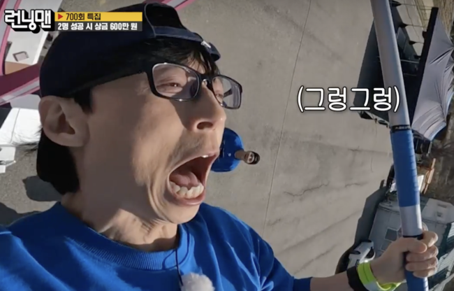 그렇게 한 바퀴 돌려고 했으나 양세찬은 “근데 나 안 될 것 같다”며 울먹였고결국 공포심에 휩싸이며 실패했다. 이를 보다 못한 송지효가 나섰다. 겁 없기로 유명한 송지효가 도전, 갑자기 “너무 재밌다”라고 외치더니 그네를 쭉쭉 뻗어갔고, 97도 높이까지 올랐다. 하지만 360도 돌기엔 실패했다.