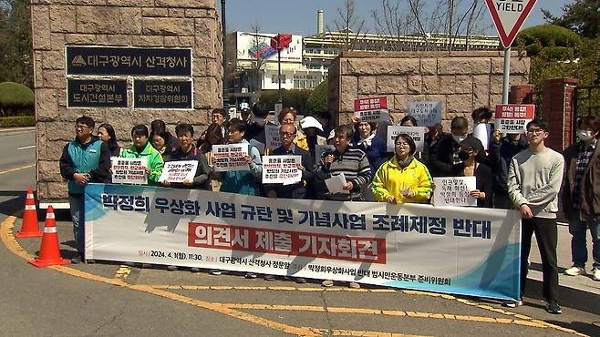 박정희 대통령 동상을 동대구역과 대구 도심에 만든다는 생각은 동의하지 않는 사람에게는 아주 도발적인 시도일 수도 있습니다. 시민단체는 한마디로 독재자의 광장과 동상은 부적절하다며 강하게 반발하고 있습니다. 대구참여연대를 비롯한 시민단체는 "민주주의에 바탕하고 변화를 기대하는 시민은 도대체 어느 시대에 살고 있는지, 대구는 과연 어디까지 퇴행할 것인지 묻지 않을 수 없다"라며 철회를 촉구했습니다. 이런 목소리가 한둘이 아니어서 여러 시민단체가 모여 '박정희 우상화 사업 반대 범시민운동본부'를 만들었습니다.
