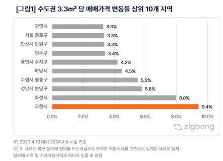 화성시(8.0%), 성남시 분당구(5.8%), 수원시 영통구(5.5%), 하남시(4.5%), 용인시 수지구(4.2%) 등이 과천의 뒤를 이었습니다. 최근 1년간 수도권 전체 매매가 변동률은 평균 -0.4%였습니다.