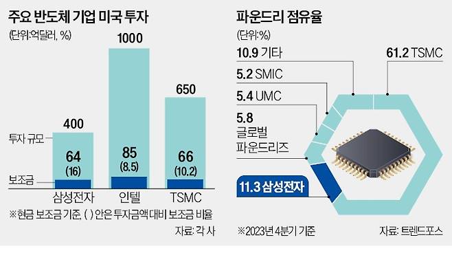미국 정부는 삼성전자에 특급 대우를 약속했다. 삼성전자가 받는 현금 보조금은 투자금 대비 16%다. 1000억달러를 투자해 현금 85억달러를 받는 인텔(8.5%), 650억달러 규모 생산시설을 짓고 현금 보조금 66억달러를 끌어낸 TSMC(10.2%)를 압도하는 많은 액수다. 인텔과 TSMC는 현금 보조금 외에 저리 대출을 각각 110억달러와 115억달러 추가로 지원받는다.
