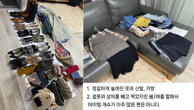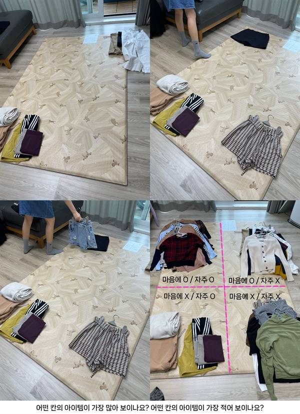 처음에는 4개로 분류하는 게 기준이 대개 애매하다고 생각했어요. 그런데 막상 하면서 보니까 내가 마음에 든다고 생각했던 (2번째 칸에 넣었던) 게 자주 안 입다 보니 마음에 안 드는 거였구나 하는 생각이 들었어요.
