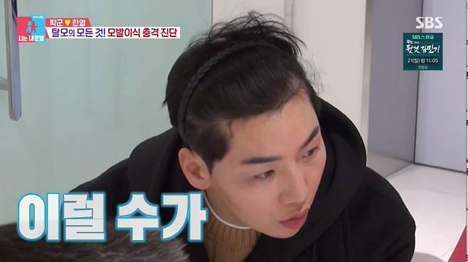 15일 방송한 SBS 예능 '동상이몽 시즌2-너는 내 운명'에서는 M자 탈모와 정수리 탈모가 진행된 박군과 한영이 헬스장에 이어 병원을 찾는 모습이 공개됐다.