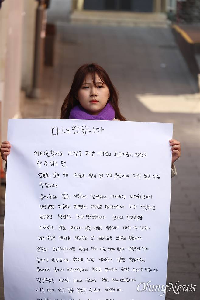 오씨는 "스무살이 되기 전까지 대한민국의 학생으로 살면서 가장 많이 들은 말이 '가만히 있어라', '애들은 조용히 해라'였다"라며 "이젠 가만히 있지 않고, 우리가 무엇을 할 수 있는지 도모하려는 태도를 가질 것"이라고 했다.