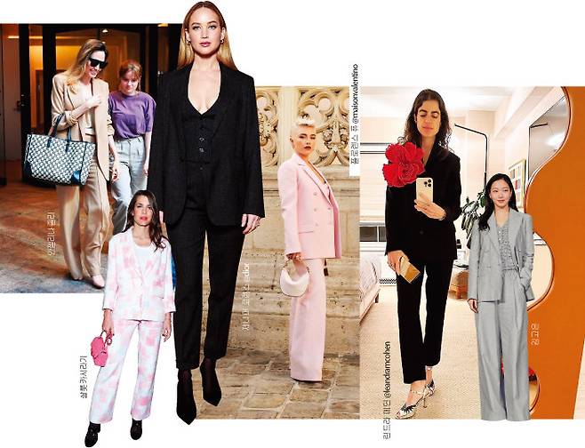 특히 순백의 신부를 더욱 돋보이게 하면서도 세련된 애티튜드를 잃고 싶지 않다면 슈트가 진리. 제니퍼 로렌스와 김고은은 블레이저와 베스트, 팬츠를 스리피스로 갖춰 입어 하객 슈트 룩의 정석을 보여줬다. 린드라 메딘은 올 블랙 슈트에 코르사주 초커를 액세서리로 더해 패셔너블한 느낌을 한 스푼 첨가했다. 좀 더 과감한 선택을 하고 싶다면, 컬러풀한 슈트를 골라 힘을 줄 것. 샬롯 카시라기, 플로렌스 퓨처럼 연한 핑크 슈트를 착용하거나 안젤리나 졸리처럼 베이지 등의 은은한 컬러와 미니멀한 디자인 슈트를 골라야 과해 보이지 않는다.