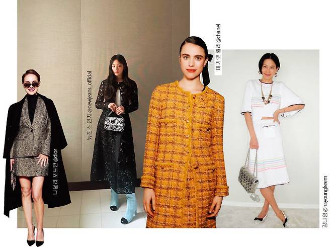 요즘 하객 룩으로 가장 즐겨 입는 것이 스커트 셋업. 과하게 꾸미지 않아도 신경 쓴 느낌과 격식을 차린 듯한 여운을 줄 수 있어서 결혼식 TPO에 적합하다. 게다가 소재에 따라 여름부터 가을, 겨울까지 다양한 선택지가 있다는 것 역시 매력적이다. 김나영은 니트 소재에 컬러 프린트가 가미된 셋업으로 청량한 룩을 완성했고, 마거릿 퀄리는 머스터드 컬러의 트위드 셋업으로 화사한 컬러감을 강조했다. 컬러가 부담스럽다면 나탈리 포트만이나 뉴진스 민지처럼 소재는 다르지만 무난한 모노톤을 선택하고 액세서리로 포인트를 더해도 좋겠다.