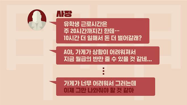 유학생들 사이에서 떠도는 괴담이 무엇이냐고 묻자, 그는 "시간 넘겨 일해서 강제 출국당한다"이라는 거다. 유학생은 1주 20시간 조건으로 일하기 시작했지만, 방학을 지나면서 지금까지 1주 30시간씩을 일했다고 한다. 20시간 초과해서 30시간을 일하라고 제안한 사장님이야 일 시키고 돈 주면 끝이라고 생각했던 모양인데, 세상 장사가 내 맘대로 됐으면 모두가 백종원 되는 거다. 장사가 생각보다 안 됐고, 유학생은 어느 날 보니 10시간 치 월급을 못 받았다고 했다. 그래도 20시간 치 월급은 꼬박꼬박 준 걸 두고 다행이라고 해야 하나. 여하튼 이 유학생은 식당에서 더 일하기를 포기했다.