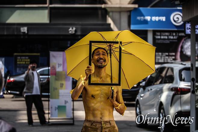 | ▲ 12일 오후 서울 종로구 인사동 아르떼숲에서 열린 4.16세월호참사 10주기 사진전 '기억은 힘이 세지’ 개막식. 오마이뉴스, 경향신문, 민중의소리, 시사IN, 한겨레신문 사진기자들과 시민들이 촬영한 보도사진 168점이 오는 28일까지 전시된다. 사진은 개막식에서 열린 이정훈의 마임퍼포먼스. |