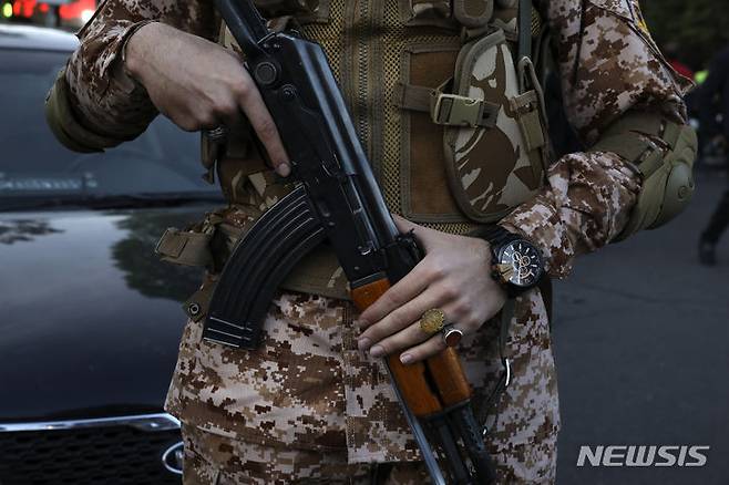 [테헤란=AP/뉴시스] 15일(현지시각) 이란 테헤란의 팔레스타인 광장에서 이란혁명군수비대 대원이 반이스라엘 시위대 주변을 경계하고 있다. 이스라엘 전시 내각이 이란의 공격에 "분명하고 강력한" 재보복을 하기로 했다고 이스라엘 매체가 전했으며 이란은 이스라엘이 재보복할 경우 다시 공격하겠다는 입장을 보인 것으로 알려졌다. 2024.04.16.