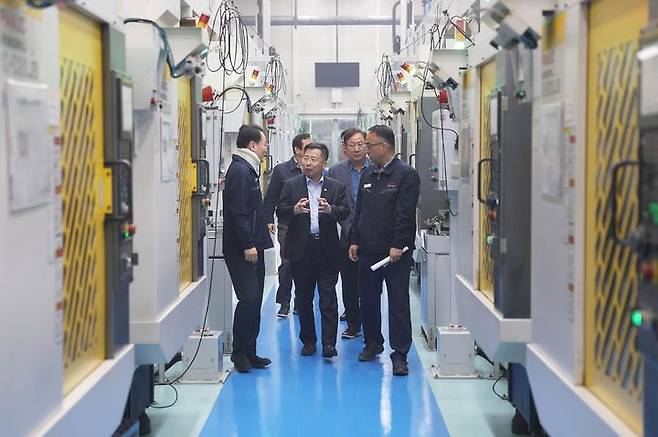 [서울=뉴시스] 강경성 산업통상자원부 1차관이 16일 충남 서산시에 위치한 자동차 배터리·모터 케이스 수출기업인 코넥을 방문해 생산라인을 둘러보고 있다. (사진=산업통상자원부 제공) 2024.04.16. photo@newsis.com *재판매 및 DB 금지