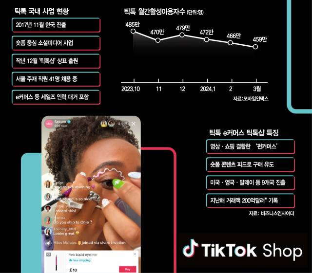 다만 국내 유통시장에서 틱톡샵이 성공하기 위해서는 틱톡이라는 플랫폼이 더 많은 인기를 끌어야 한다는 지적도 나온다. 모바일 빅데이터 분석 업체 모바일인덱스에 따르면 올해 3월 기준 틱톡의 월간활성이용자수(MAU)는 459만 명을 기록하며 전년 동기(453만 명) 대비 소폭 증가하는 데 그쳤다. 알리·테무가 단기간에 국내 시장에서 MAU를 폭발적으로 늘린 것과는 대조적이다. 다만 틱톡 관계자는 “상표 출원은 했지만 틱톡샵 오픈에 대해서는 구체적인 계획이 없다”며 “한국의 경우 e커머스 시장이 경쟁적이고 고도화돼 있어 진출이 쉽지는 않을 것으로 본다”고 설명했다.