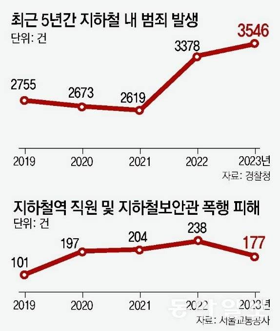 16일 경찰청에 따르면 지난해 서울 내 지하철 범죄는 절도, 성추행, 불법 촬영 등을 포함해 총 3546건으로 하루 평균 9.7건이 발생했다. 2021년 2619건, 2022년 3378건에 이어 최근 10년 내 최대치를 기록한 것으로 확인됐다. 지하철 보안관 및 역 직원을 대상으로 한 폭행 피해도 이틀에 한 번꼴로 발생하고 있었다.