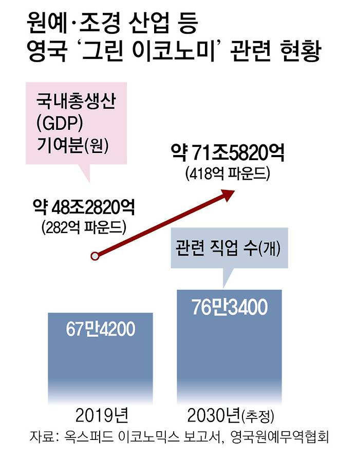 영국건강보험(NHS)은 정신적, 육체적 처방의 하나로 숲 교육, 원예 등을 포함한 각종 녹색활동을 장려하고 있다. 녹색활동의 경제적 혜택을 분석한 결과 참가자 82명이 1년 동안 의료비용을 3만8646파운드(약 6673만 원) 절감했다는 연구 결과도 나왔다. 옥스퍼드 이코노믹스 보고서에 따르면 조경 원예 등 녹색산업이 영국 국내총생산(GDP)에서 차지하는 비중은 2030년 418억 파운드(약 71조5820억 원)까지 늘어날 것으로 전망된다. 관련된 일자리 수는 76만3400개에 이를 것으로 추산하고 있다.
