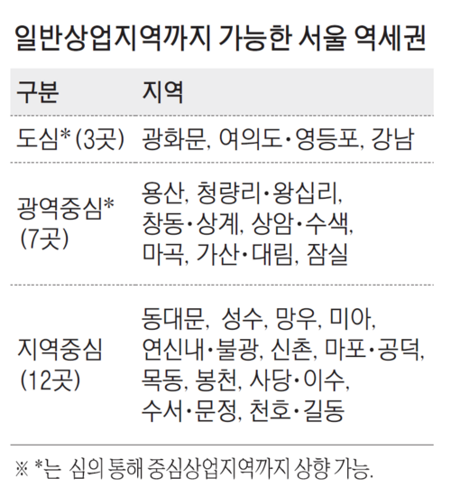 서울시는 급지가 좋은 3도심과 7광역중심에 속한 역세권 용지는 용도지역을 일반상업지역까지 올려줄 계획이다.