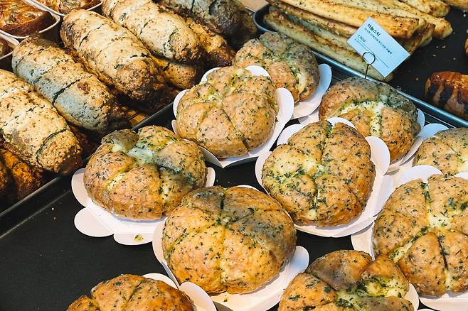 매장에서 직접 빵을 굽기 때문에 고소한 냄새가 사방 천지에 감돈다. 딸기 생크림 크루아상, 초코 휘낭시에, 쪽파크림치즈 소금빵, 크로플, 스콘, 몽블랑 등 전문 베이커리를 방불케 하는 라인업을 자랑한다. 한편에는 전날 만든 빵에 한해 50% 할인도 진행한다.