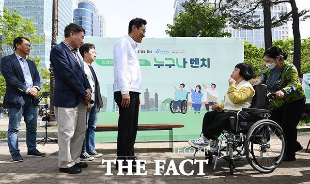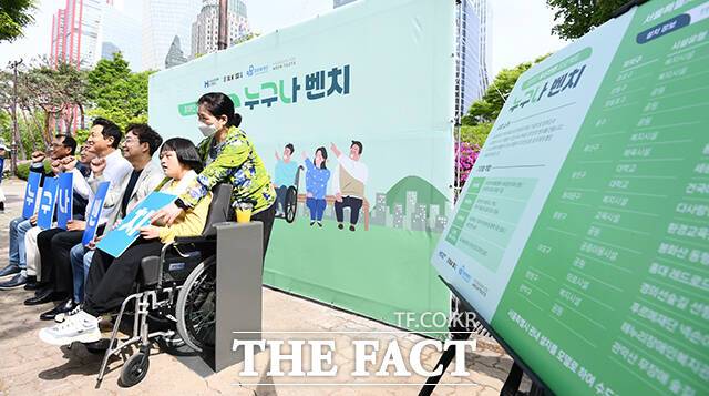 이날 공개된 '누구나 벤치는' 벤치에 휠체어 공간을 두어 장애인과 비장애인이 나란히 앉을 수 있도록 설계됐으며 컵홀더도 첨가해 기능성을 높였다.
