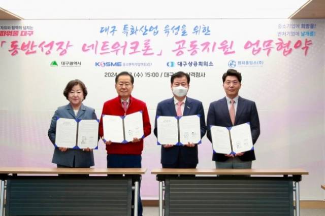 중소벤처기업진흥공단(중진공)은 대구광역시, 대구상공회의소(대구상의), 평화홀딩스와 대구광역시 특화산업 육성을 위한 '동반성장 네트워크론 공동지원' 업무협약을 체결했다고 17일 밝혔다.