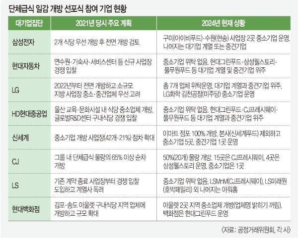 17일 국민일보가 공정거래위원회 주관으로 지난 2021년 4월 단체급식 일감 개방 선포식을 가졌던 8개 대기업집단(삼성·현대자동차·LG·HD현대중공업·신세계·CJ·LS·현대백화점)이 당시 밝힌 계획안을 토대로 개방 실적을 조사한 결과 단체급식 일감 나누기는 ‘용두사미’에 그쳤다. 특히 범LG·현대가에서는 대기업 간 돌려막기나 친족 몰아주기 관행이 여전한 것으로 나타났다. 대기업 계열사 간 손바뀜이 뚜렷했고, 단체급식 시장 점유율 10위권 내 중견기업의 약진이 두드러졌다. 예를 들어 삼성전자는 기존의 삼성웰스토리 물량을 CJ프레시웨이나 아워홈, 신세계푸드, 풀무원푸드앤컬처, 본푸드서비스 등이 나눠 갖는 식이다.