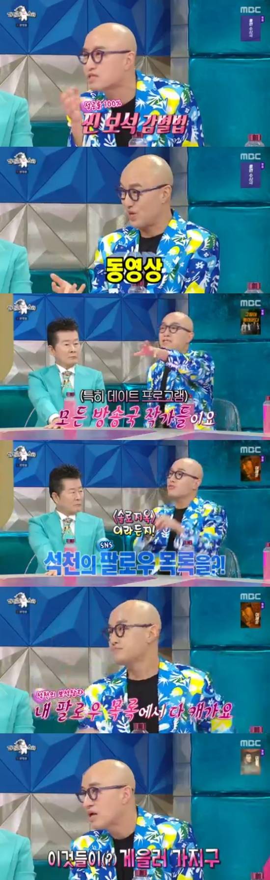 김구라는 "잘 생긴 사람들 말고 상태 안 좋은 사람들은 못 나오는거냐"고 물었고, 홍석천은 "넌 절대 출연 못 해"라고 돌직구를 날린 후 "꽃미남도 중요하지만, 얼굴 정면을 봐야 알 수 있다. 그리고 찐 보석을 알 수 있는 방법은 사진 말고 동영상으로 확인을 하는거다. 동영상은 보정이 어렵다"고 말했다.