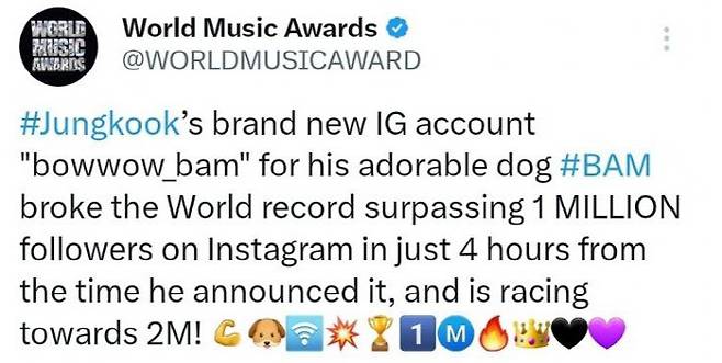이에 '유럽의 빌보드'로 불리는 '월드뮤직어워드'(WMA)는 "정국이 새롭게 개설한 'Bowwow_bam'는 역대 반려동물(Pet) 인스타그램 계정 중 가장 빠른 시간인 4시간 만에 팔로워 100만을 돌파하여 세계 신기록을 경신했다"고 전했다.