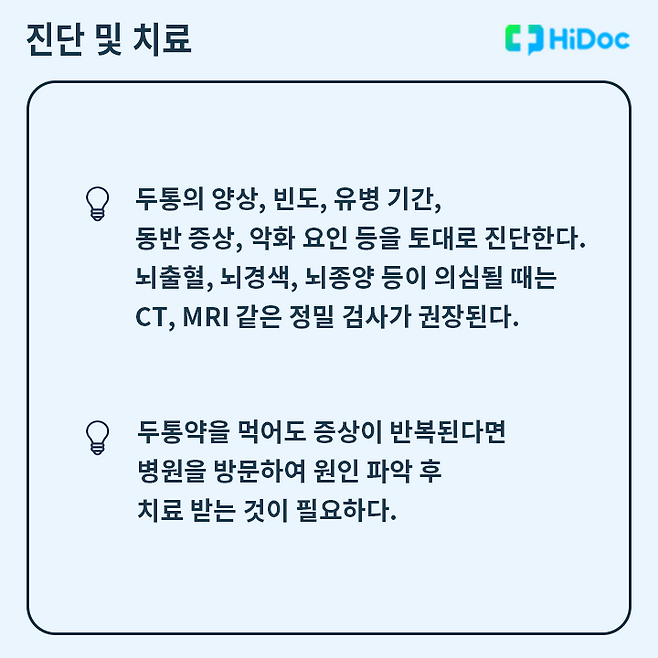 만약 한 달에 절반가량 두통이 3개월 이상 지속되고 구토나 발한과 같은 증상이 나타나면 병원을 방문해 두통의 원인을 파악하고 치료해야 한다. 무작정 두통약을 먹으면 오히려 증상이 심해질 수 있어 주의가 필요하다.