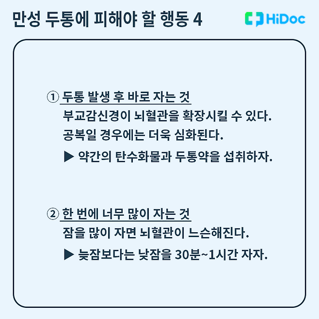 또한 두통이 생겼다고 공복인 상태로 바로 수면하거나, 한 번에 너무 오랜 시간 잠을 자는 것도 뇌혈관을 확장시켜 두통을 악화시킬 수 있다.