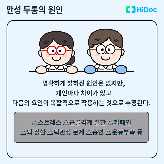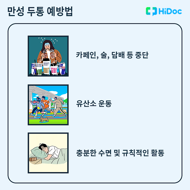 만성 두통은 일반 두통보다 빈도가 잦고 통증 강도가 심해 일상생활에 어려움을 겪게 되고, 심할 경우 우울증이 동반될 수도 있다. △스트레스 △근골격계 질환 △뇌질환 △턱관절 문제 △흡연 △카페인 섭취 △운동 부족 등 다양한 원인으로 발생할 수 있다. 예방을 위해서 평소 유산소 운동, 충분한 수면, 규칙적인 활동 등의 건강한 생활습관을 갖는 것이 필요하다.