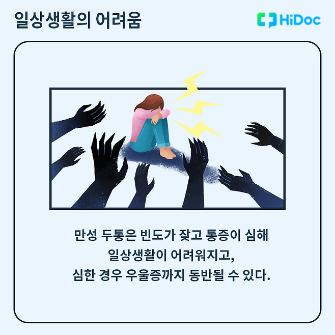 만성 두통은 일반 두통보다 빈도가 잦고 통증 강도가 심해 일상생활에 어려움을 겪게 되고, 심할 경우 우울증이 동반될 수도 있다.
