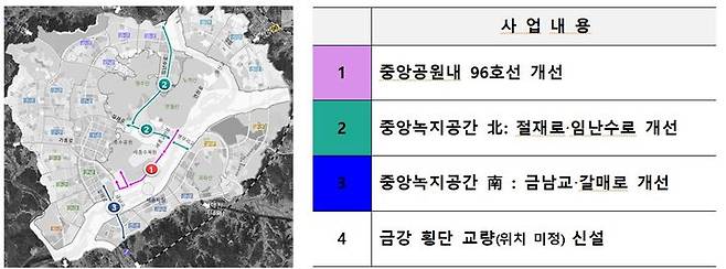또 중앙공원을 횡단하는 96호선 도로는 중앙공원 계획을 고려해 모양을 선형으로 조정하고 보행자와 차량 안전, 환경을 고려해 노선을 계획한다. 중앙녹지공간 남측 금남교·갈매로는 2차로 확장을 검토하고 갈매로~나성1·2교~중앙공원과 연계할 예정이다.