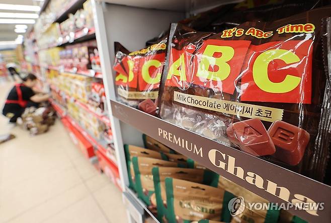 (서울=연합뉴스) 이재희 기자 = 18일 롯데웰푸드가 코코아 가격 급등을 이유로 다음 달 1일부터 대표 초콜릿 제품 가나초콜릿을 200원 올리고, 빼빼로 가격을 100원 올리는 등 초콜릿이 들어가는 17종 상품의 평균 가격을 12% 인상하기로 했다. 사진은 이날 서울 한 대형마트에 진열된 롯데의 초콜릿 제품들. 2024.4.18