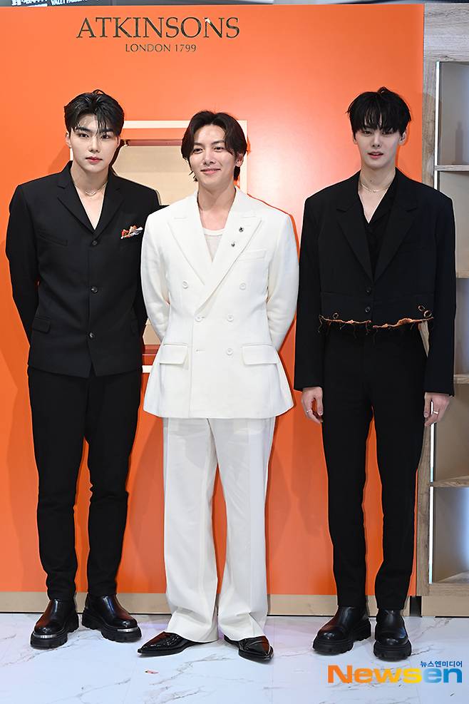 (왼쪽부터) 제로베이스원 박건욱, 배우 지창욱, 제로베이스원 김규빈이 4월 18일 오후 서울 송파구 롯데백화점 잠실점에서 열린 ‘앳킨슨(ATKINSONS) 1799)’ 향수 국내 런칭 기념 행사 포토콜 행사에 참석해 포토타임을 가지고 있다.