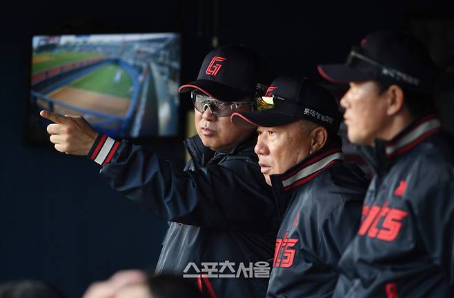 롯데 자이언츠 김태형 감독(왼쪽)이 18일 잠실구장에서 열린 2024 KBO리그 LG 트윈스와 경기 1회초 김광수 코치와 이야기를 나누고 있다. 2024. 4. 18. 잠실 | 박진업 기자 upandup@sportsseoul.com