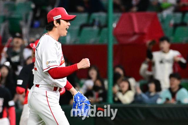 [마이데일리 = 인천 곽경훈 기자] 18일 인천SSG랜더스필드에서 진행된 '2024 신한 SOL 뱅크 KBO 리그' 기아-SSG의 경기. SSG 문승원이 9회말 무실점으로 호투한 뒤 환호하고 있다.