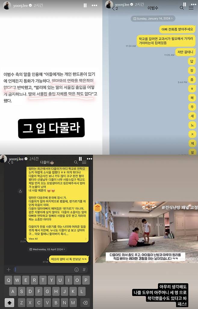 이어 '남편인 이범수와 연락이 안되지 않는다'는 유튜버 주장에 대해 문자 대화를 읽지 않는 이범수 전화기 정황을 공개하고, 아들의 핸드폰도 자신의 메세지가 읽음 표시가 되지 않는 모습을 캡쳐해 공개하기도 했다. 또 자신이 집안일과 인테리어를 하는 바쁜 모습을 공개하며 "아무리 생각해도 나를 도우미 아주머니 세 명으로 착각했을 수도 있다고 봐 패스!"라고 덧붙이며 강력 반박에 나섰다.