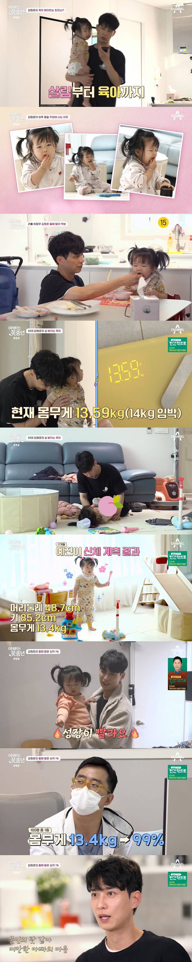 김원준을 딸을 위해 감자전을 만들었고, 잘 먹는 딸의 모습에 행복한 미소를 짓는 등 딸바보 면모도 자랑했다. 현재 14kg에 임박한 딸. 김구라는 "우리 딸이 31개월인데 11kg, 12kg 나간다"며 놀랐다.