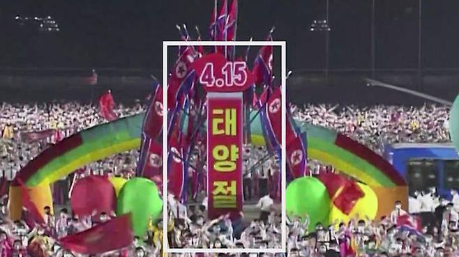 시설물은 같은 형상인데 태양절 이란 문구 대신 4.15 글자가 적혔고 건물을 활용한 대형 조명에서도 태양절이 아닌 날짜만 표시됐습니다.