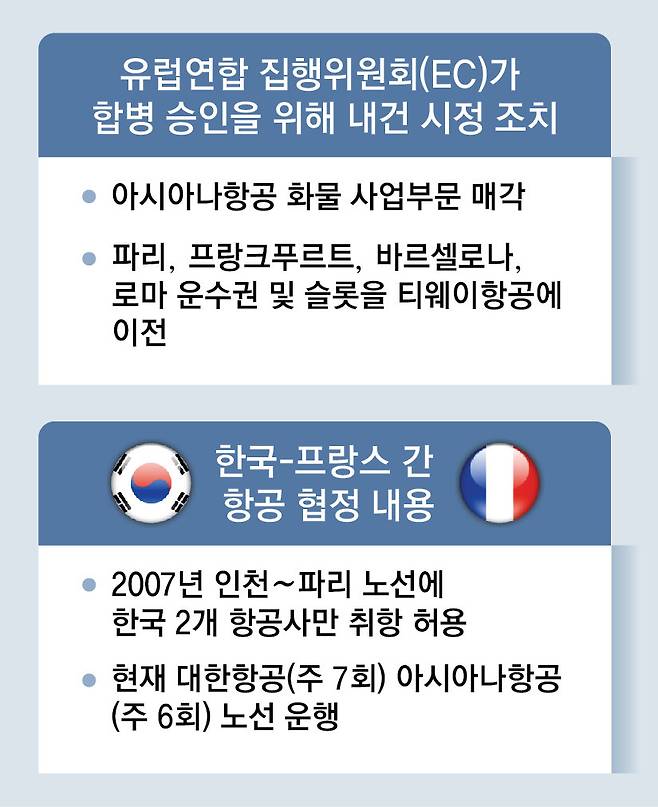 문제는 EC가 올해 2월 대한항공과 아시아나항공 통합을 조건부로 승인하면서 독점이 우려되는 인천∼파리 노선에 대해 “대체 항공사를 취항시키라”고 요구한 것과 프랑스 정부의 입장이 상충된다는 것이다. EC의 결정에 따라 대한항공은 티웨이항공을 대체 항공사로 지정하고 ‘A330-200’ 항공기 5대와 승무원 약 100명을 이관하며 지원에 나선 상황이다. 티웨이항공은 이르면 6월 말 파리 노선을 취항할 계획이었다.