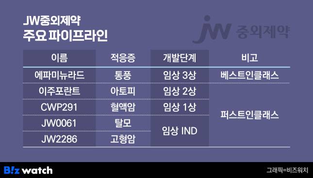 18일 JW중외제약이 개발 중인 신약후보물질을 보면 현재 임상이 진행 중이거나 연내 시작할 예정인 약물은 총 5개로 집계됐다. 개발단계가 가장 앞선 순서대로 △통풍신약 '에파미뉴라드(개발명 UCU-102)' △아토피치료제 '이주포란트(JW1601)' △혈액암치료제 'CWP291' △탈모치료제 'JW0061' △고형암치료제 'JW2286'가 이름을 올렸다.