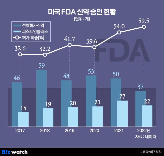 상위 글로벌 제약사들은 퍼스트인클래스 신약 개발을 통해 수백조원의 매출을 내는 기업으로 성장했고 지속적으로 관련 연구개발(R&D)을 확대하는 추세다. 지난 2022년 FDA로부터 허가받은 신약 중 59.5%가 퍼스트인클래스로 5년 전과 비교해 26.9%포인트 증가했다. 아직 우리나라에서 개발된 퍼스트인클래스 약물은 없다.