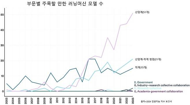 보고서에 따르면 인공지능의 최전선을 이끌고 있는 연구는 대부분 산업계에서 이뤄지고 있다. 2023년 산업계에서는 51개의 주목할 만한 머신러닝 시스템을 개발한 반면, 학계에서 내놓은 것은 15개에 그쳤다. 오스틴 텍사스대 인공지능연구소의 레이몬드 무니 소장은 국제학술지 네이처에 “학계의 연구는 기업에서 나오는 모델을 분석하고 약점을 파헤치는 쪽으로 방향을 바꾸고 있다”고 말했다.