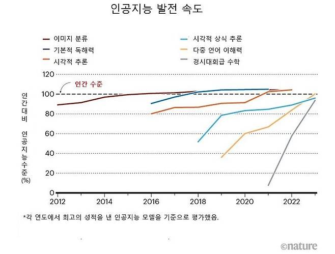 챗지피티와 같은 인공지능 시스템이 영어 이해도, 이미지 분류, 시각적 추론 등을 포함한 몇 가지 기본적 업무 분야에서 인간을 뛰어넘는 수준에 이르렀다는 평가가 나왔다.