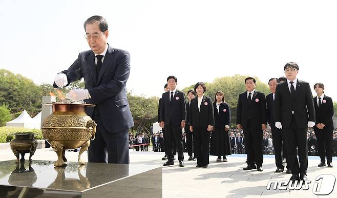 (서울=뉴스1) 박지혜 기자 = 한덕수 국무총리가 19일 서울 강북구 국립4.19민주묘지 기념탑에서 분향하고 있다. (공동취재) 2024.4.19/뉴스1
